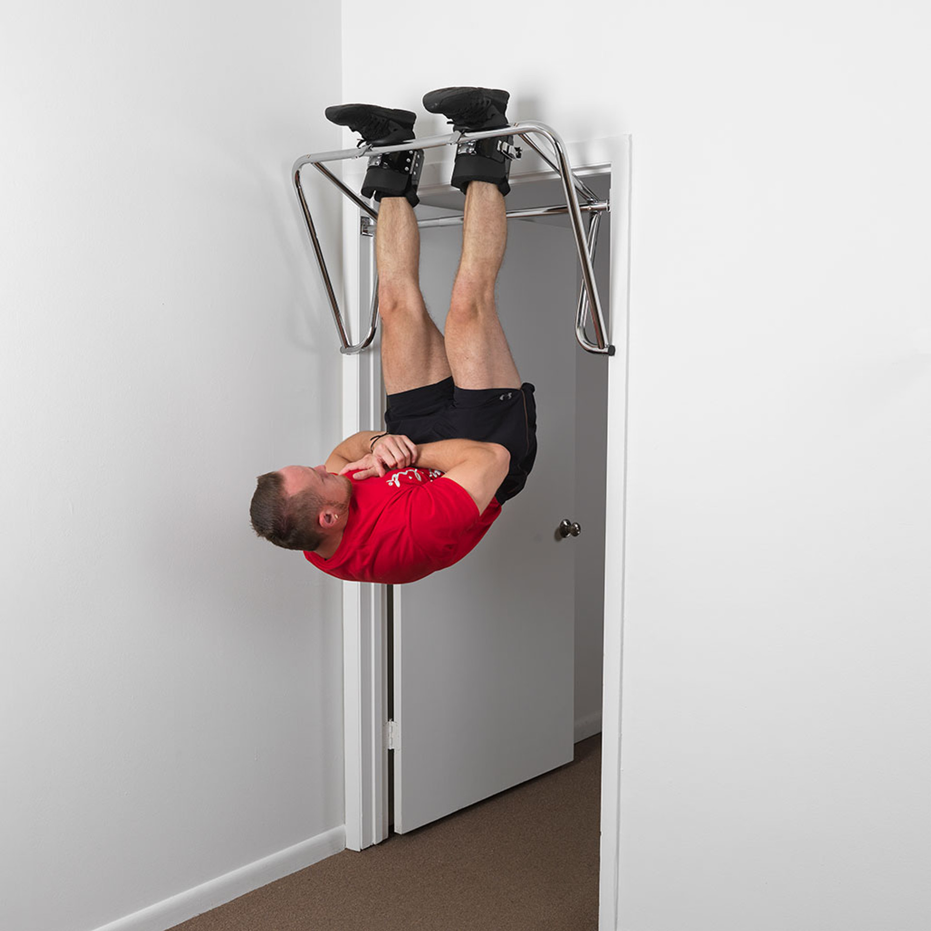 Multi-use design is large and sturdy enough for the big boys. Quickly and easily mounts to doorway frame. Infinitely adjustable from 29″ to 38″ in width and extends a full 10″ out and away from doorway frame for head clearance when doing full-range pull-ups. Convenient lift-out design for easy storage. Includes mounting hardware. Capacity: 300 lbs.