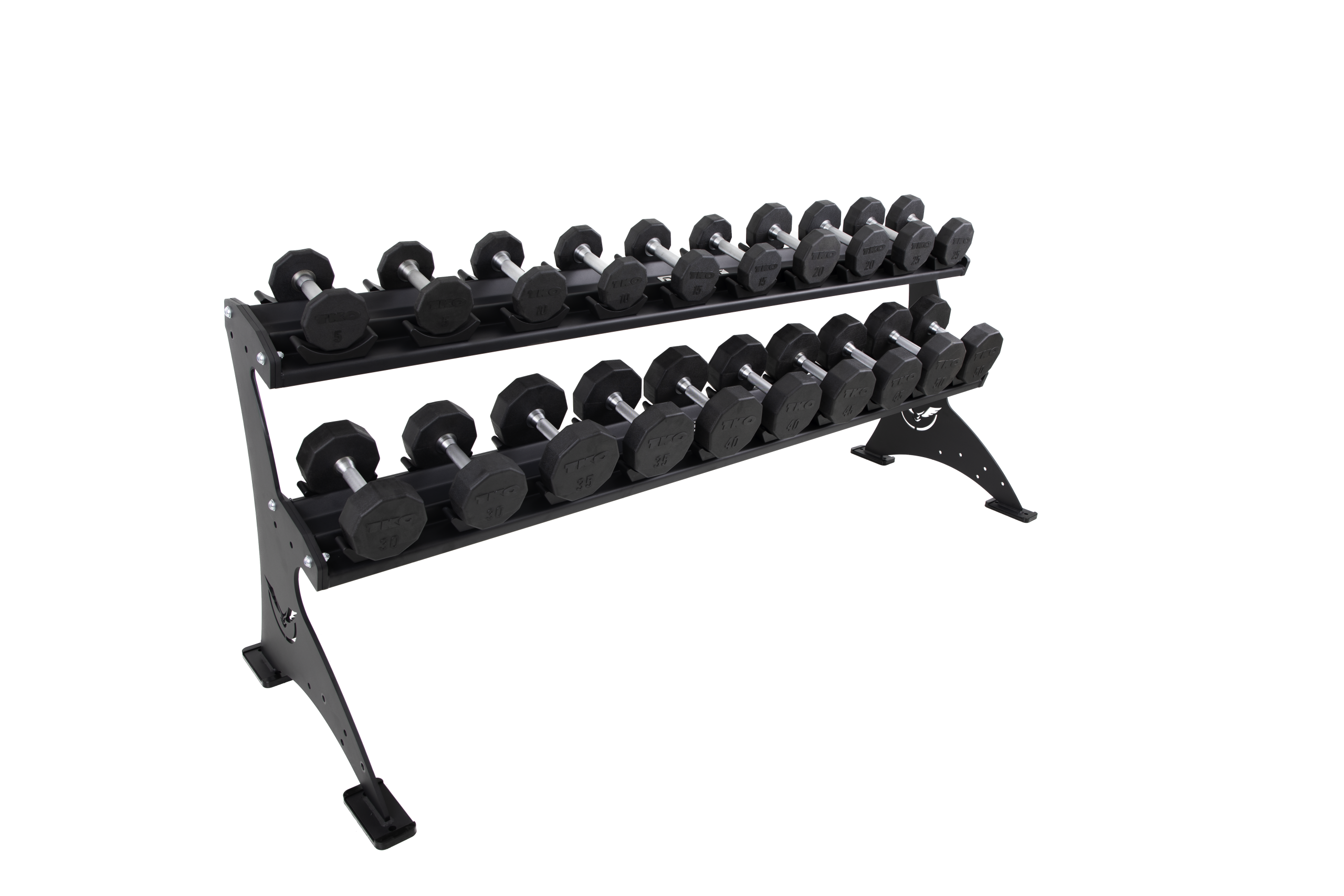- Complete 5-50 lb Dumbbell Organization — purpose-engineered saddle geometry for ten-sided dumbbells provides the most secure, most organized horizontal dumbbell storage available for the full commercial weight range