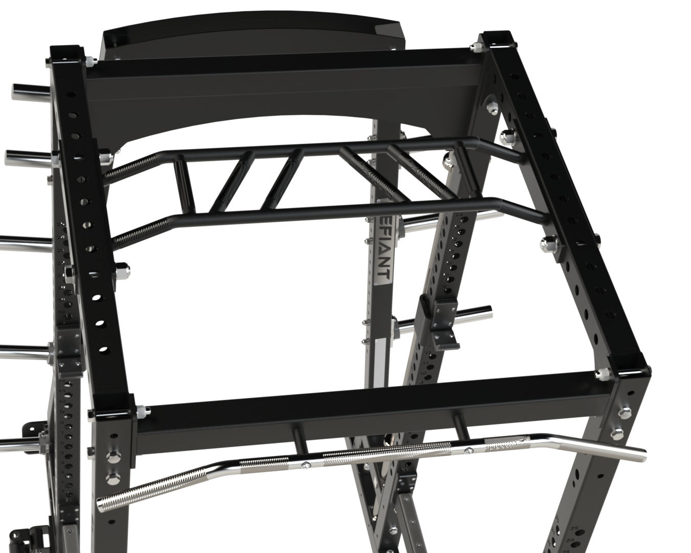 And at the top of the rack, the arched top plate comes standard with the Defiant logo — or can be fully customized with your facility’s own logo, making this power rack a genuine centerpiece of your brand and your training environment.