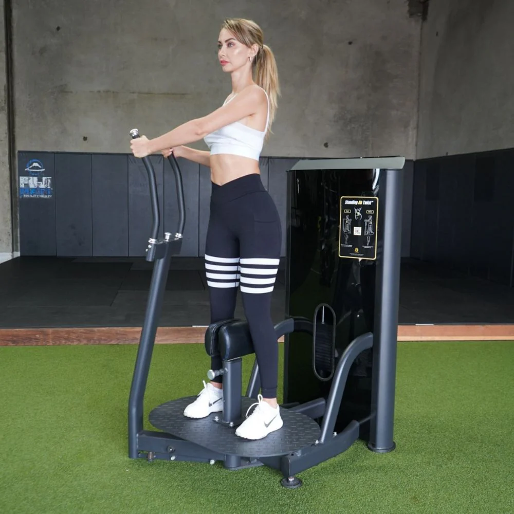 Standing on a large stable platform, step into authentic rotational fitness. Grab the ergonomic handles and twist your upper body against resistance. Your lower body stays stable while you rotate side to side targeting your oblique muscles. This standing rotational core training mimics real-world functional movement patterns that athletes and active individuals need. Your midsection develops true athletic strength through rotational exercises that compound core movements can’t provide.