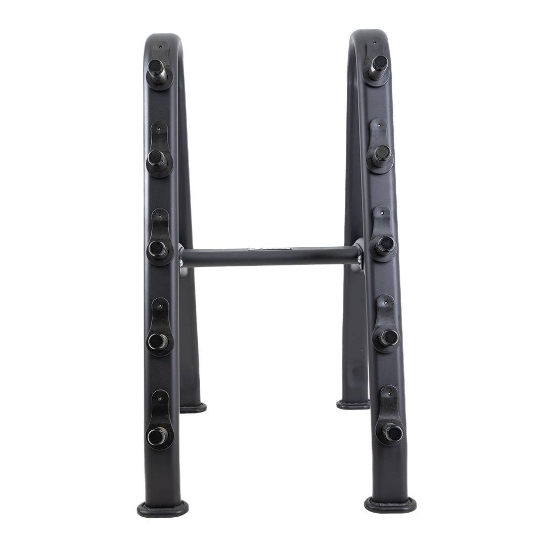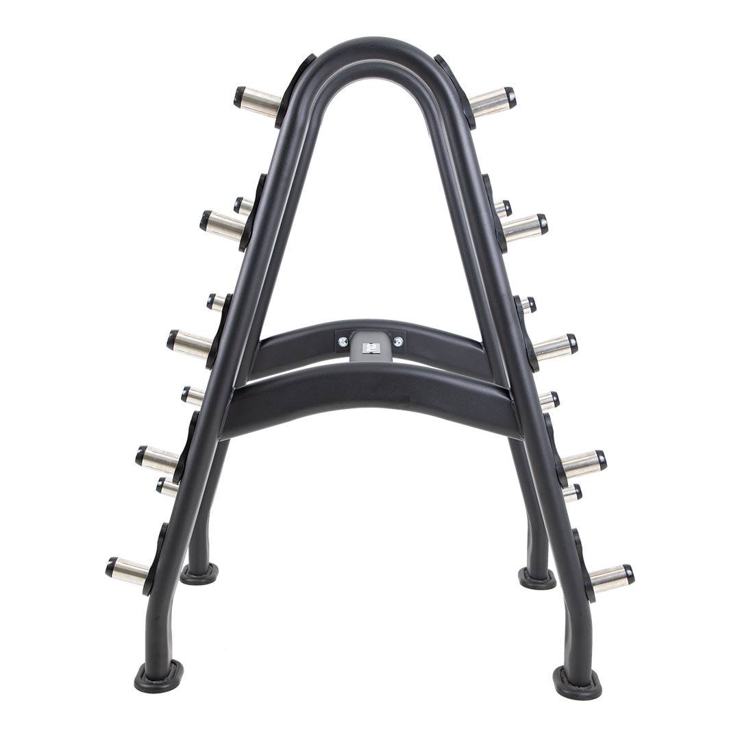 Specifications: SKU 846BBR-BK | Holds any combination of 10 barbells from 20 to 110 lbs | Heavy-gauge steel construction with powder coated finish | Stainless steel bar holders | Rubber feet for floor protection | Matte black frame | Dimensions 51″H x 28″W x 41″D | 10-year frame warranty and 1-year parts warranty. Barbells sold separately.