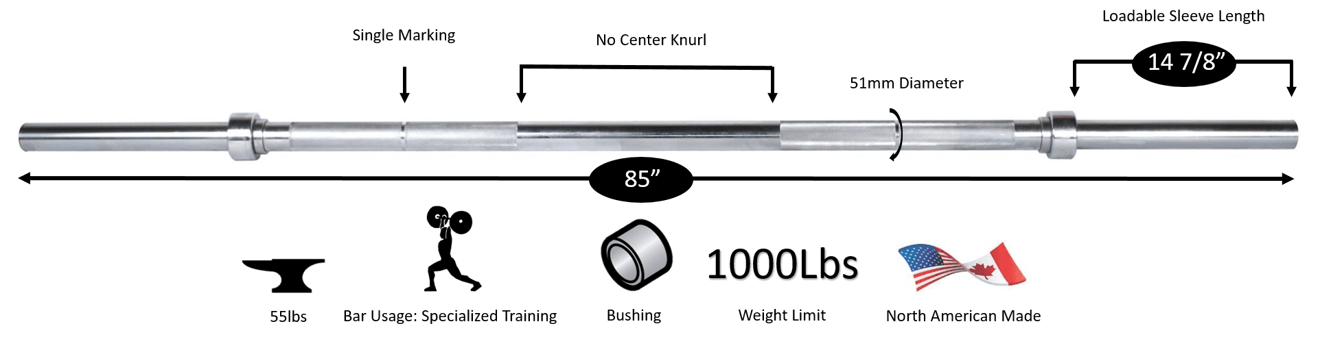 This 7’ weight bar features a 2”/51mm diameter grip for increased forearm endurance and strength. The chrome finish and nut bolt assembly bolster the bar with North American Steel. Build the grip strength you need and want with this fat bar while you perform chest press, shoulder press, or arm curls, to name a few upper body exercises.