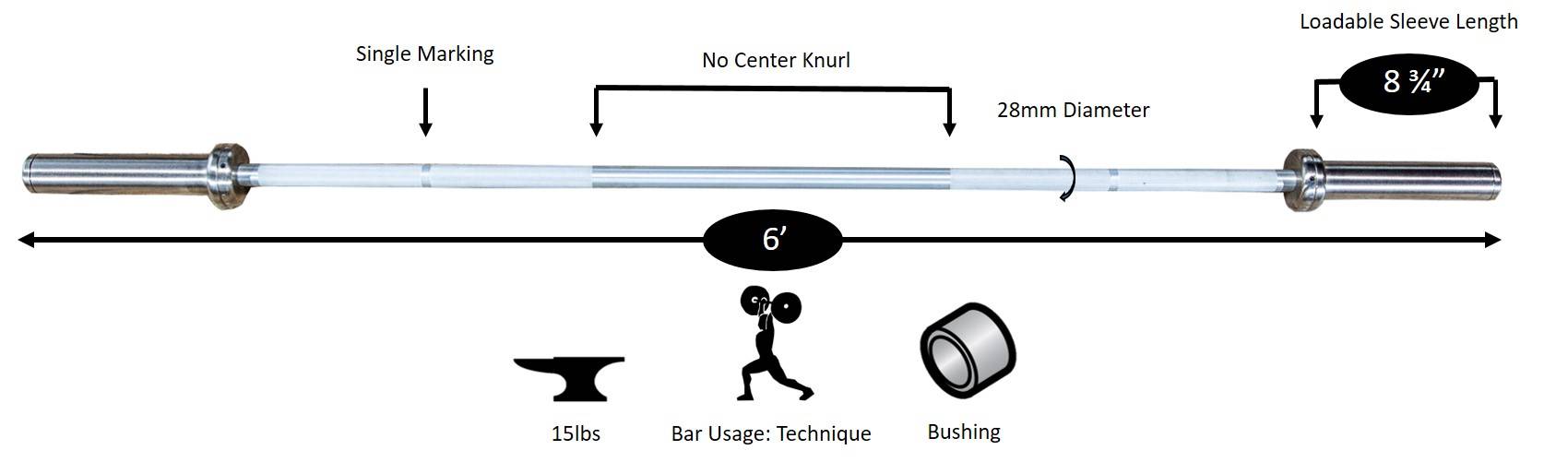 The YORK® Ultra-light aluminum bar model 32032 is the perfect bar for the training of proper lifting technique. The 6’ bar weighs only 15 lbs. This bar is great for learning technique or youth training. This bar has a 150 pound test rating.